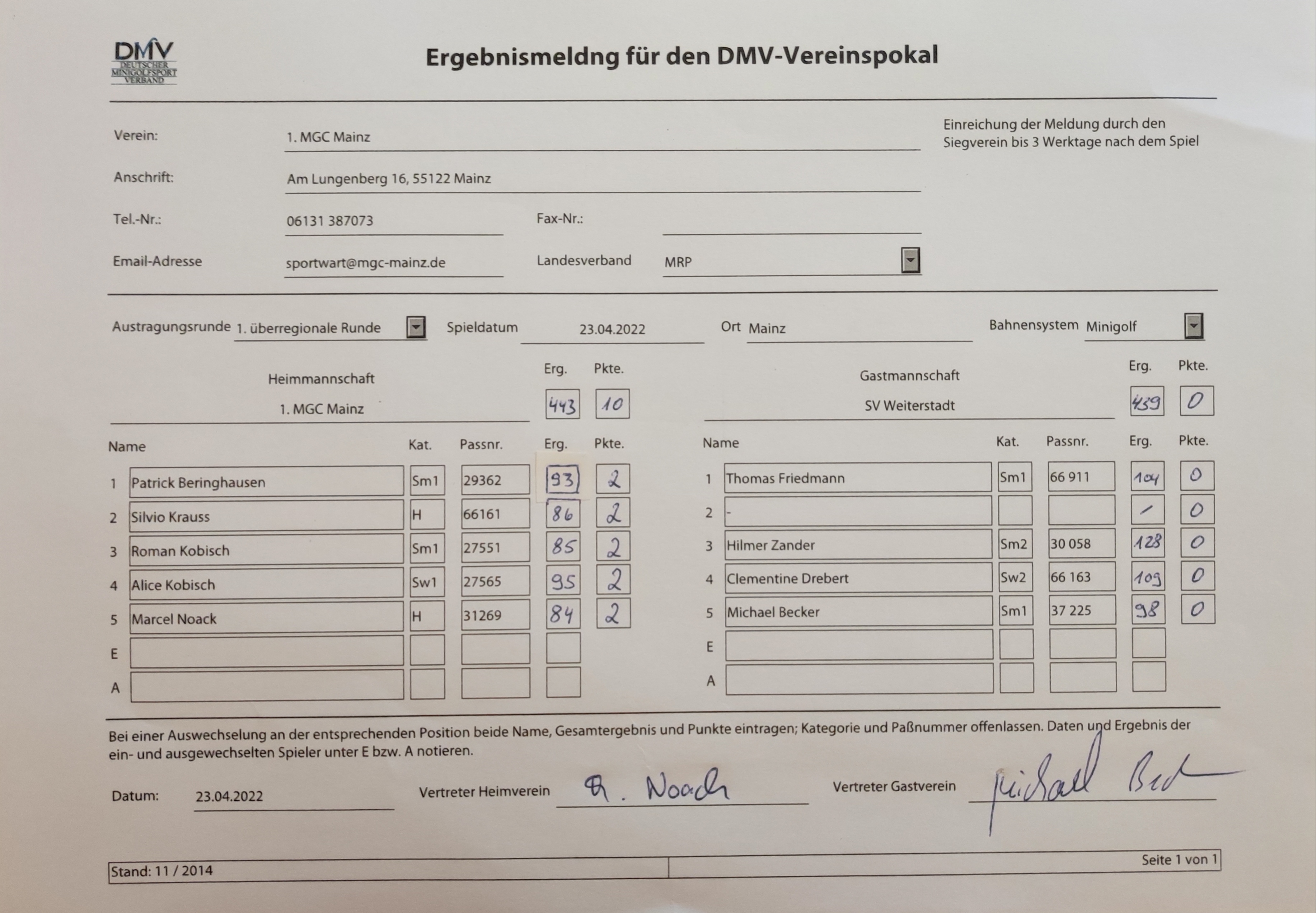 1. MGC Mainz — SG Weiterstadt (23.4.2022, 9:30 Uhr), Endstand: 10-0. Ergebnismeldung